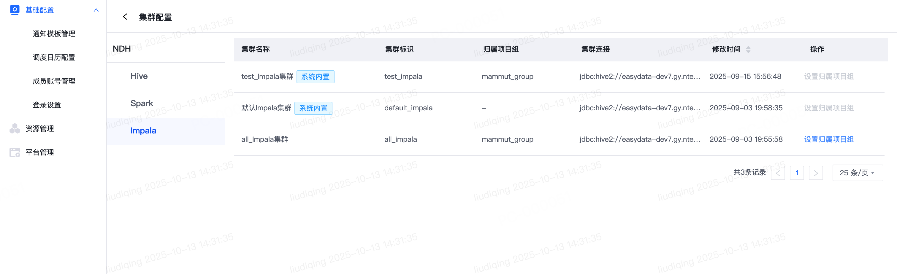 - 由运维人员在后台登记Impala集群信息后,在“平台管理-资源管理-集群配置”会展示当前平台-集群下的Impala集群,支持由平台管理员设置归属项目组。注意:如果该Impala集群的归属项目组已设置授权项目授权,则不可修改归属项目组。