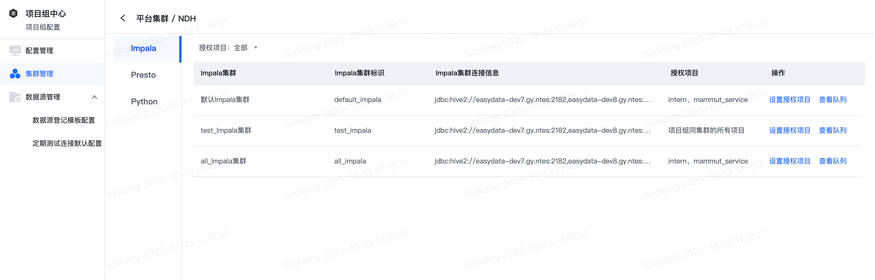 此处展示当前项目组-集群下的Impala集群,支持由项目组负责人/管理员设置授权项目和查看使用该Impala集群的Impala队列。注意:如果该Impala集群的授权项目下已存在Impala队列绑定了该集群,则对应项目不可取消授权。