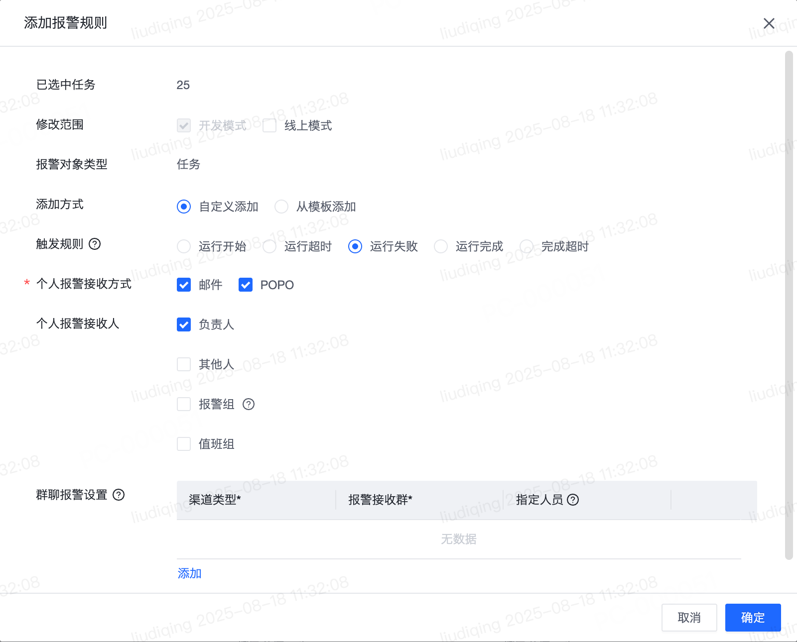 触发规则如果选择:任务运行超时、任务完成超时、节点运行超时,不支持配置具体超时时间,系统将自动删除选中任务下所有对应类型的报警规则。