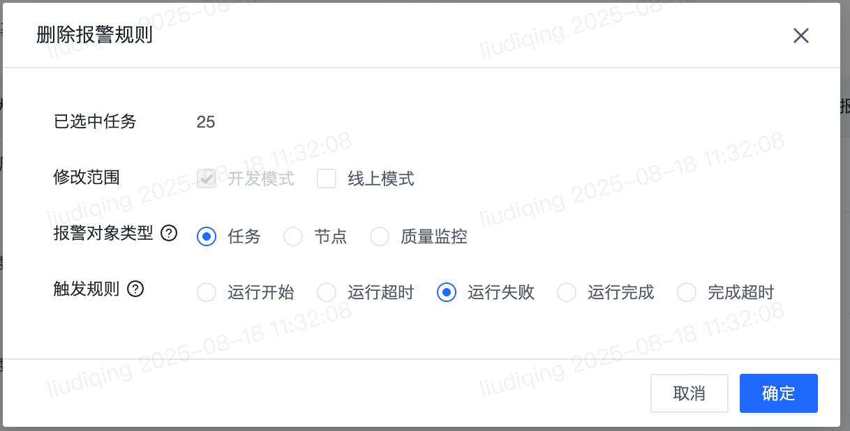 报警对象类型如果选择节点/质量监控,将删除选中的任务下所有满足触发规则的节点/质量监控的报警规则。