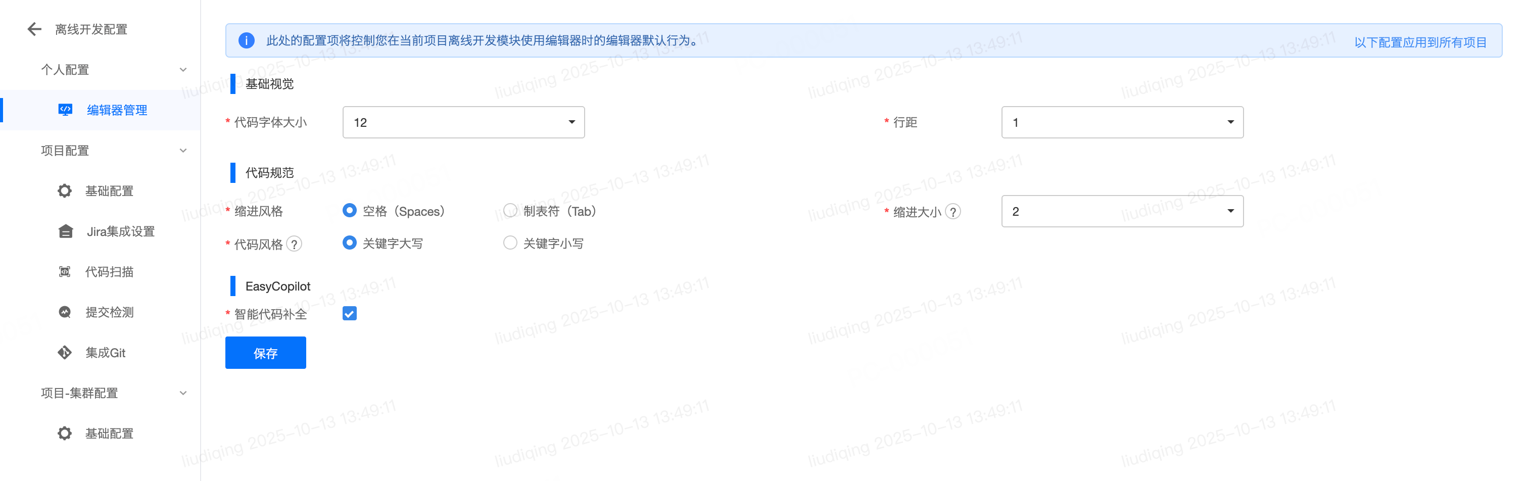 编辑器管理编辑器管理此模块为用户粒度,可用于设置该用户在当前项目的离线开发模块使用编辑器时的编辑器默认行为,设置范围包含:基础视觉、代码规范、EasyCopilot。 点击“以下配置应用到所有项目“,可将该用户在当前项目的配置应用到当前用户所在的平台下所有项目。