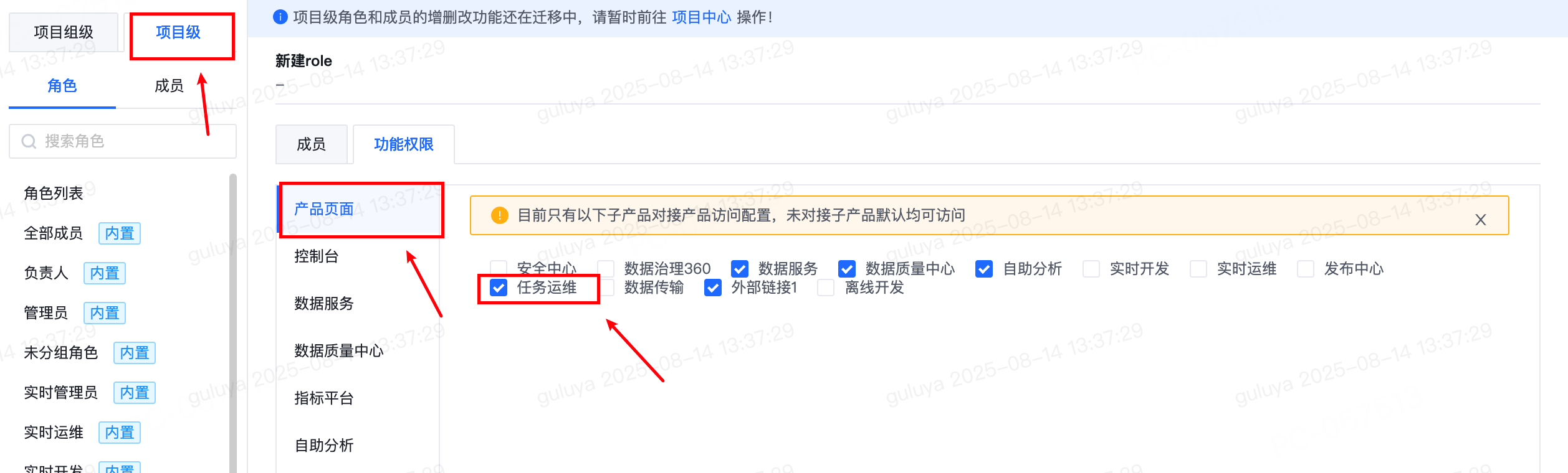 - 任务运维中心的页面访问权限控制原先是在项目中心-功能权限中进行相关设置和授权,此次更新后,页面访问权限控制内容将迁移至安全中心-项目级角色编辑权限-产品页面访问权限。原先用户的权限将同步迁移,不影响用户使用。