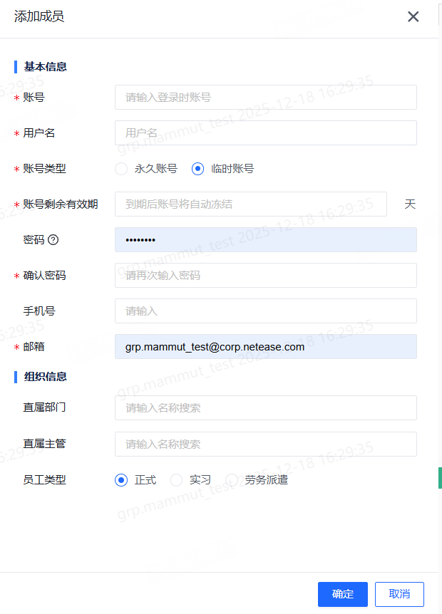 点击添加成员,需要填写成员的用户名、密码等信息,且支持配置账号类型,若为临时账号,还需要设置账号的有效期,有效期到了之后该账号将会被冻结而无法访问产品页面。
