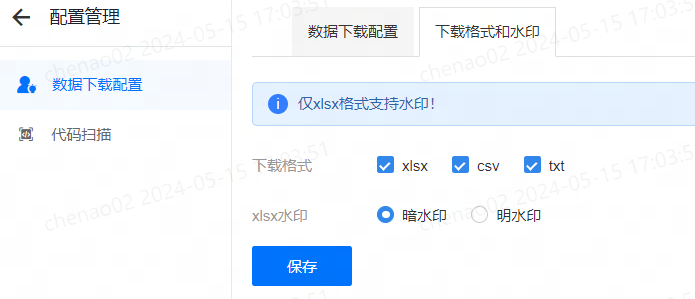另外还支持配置可下载的格式,以及下载之后添加水印的功能。