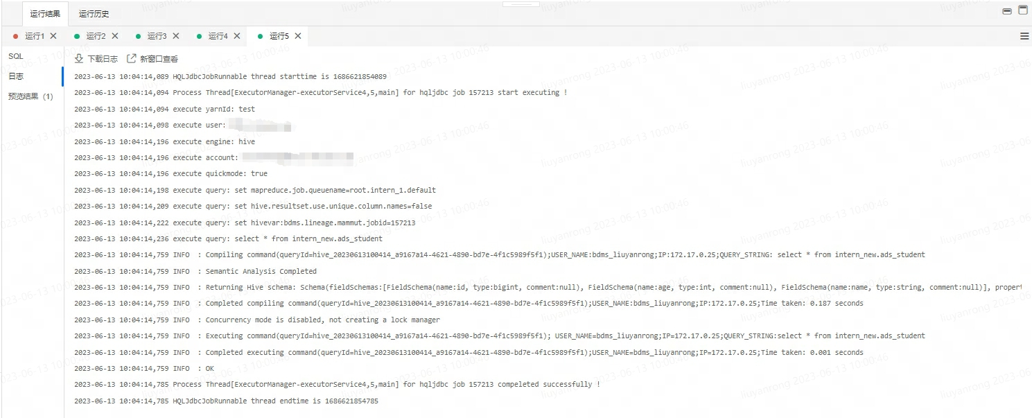 当运行query后,可在结果栏中查看运行结果、运行日志和运行历史。同时支持查询结果的复制和下载。