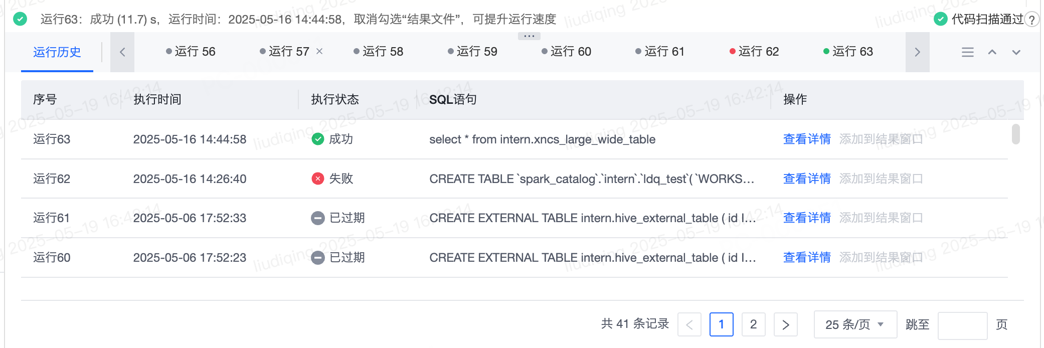 点击查看详情,支持查看该运行批次的运行设置、SQL、日志和结果。 |