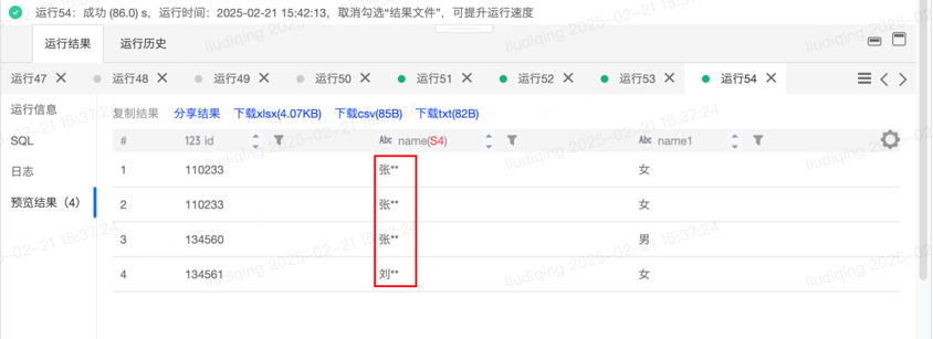 若是在安全中心配置动态脱敏后,非白名单的用户在自助分析查看和下载数据时,看到的会是脱敏之后的内容。
