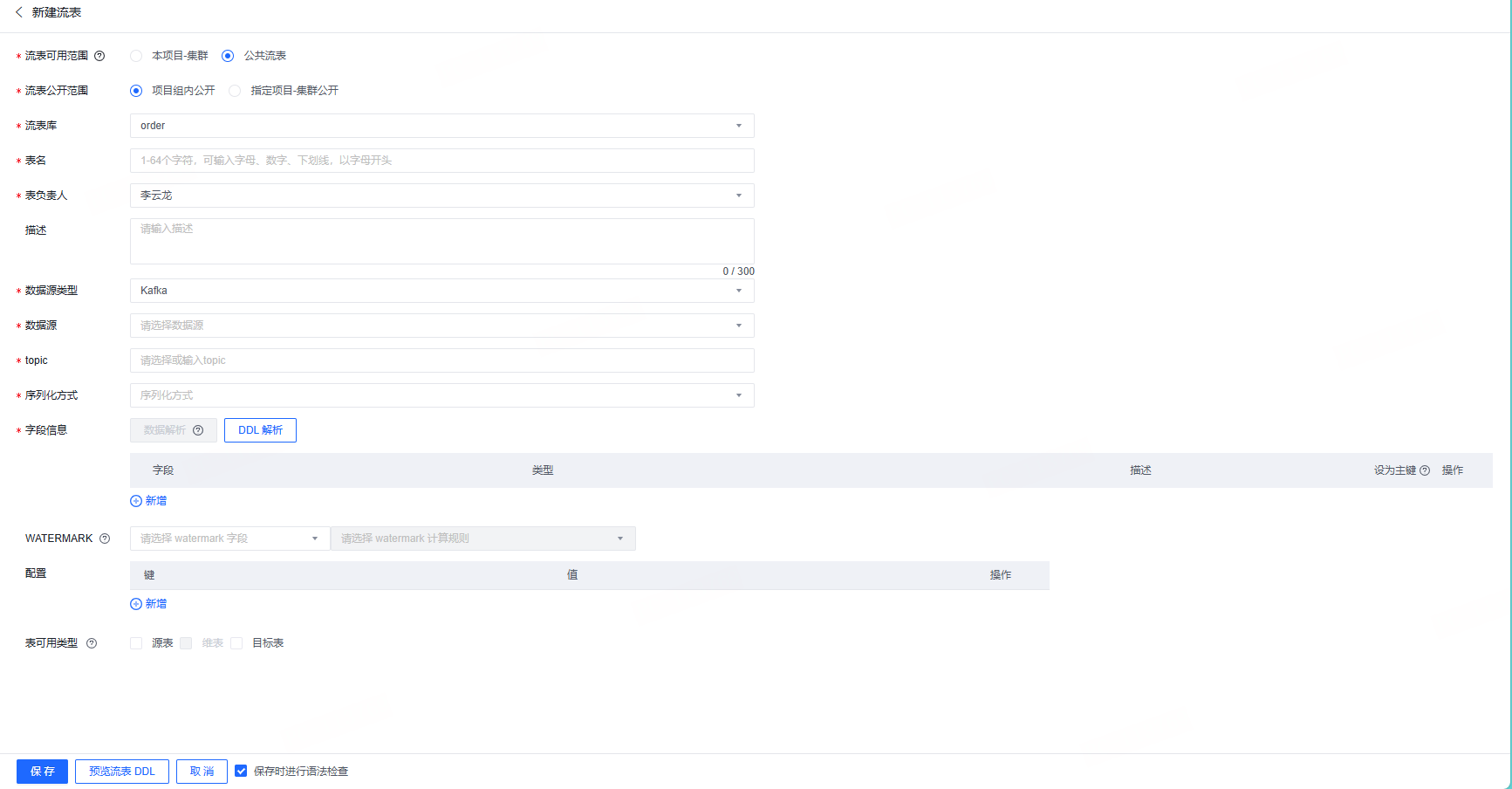 | 表名 | 流表名称,任务开发时将直接使用此名称。 | |